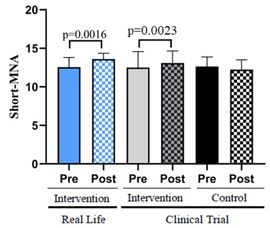 Nutritional status assessed with the Short-MNA Scale. Real-Life Intervention n = 50, Clinical Trial Intervention n = 51, Clinical Trial Control n = 49. Bars represent mean ± SD. Statistical analysis was performed with the Student’s t test for paired samples and the Wilcoxon test for non-parametric samples.