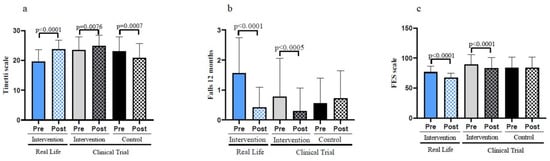 Figure 4a shows that an exercise program lowers the risk of falls when the gait and balance (Tinetti scale) data is compared between the basal values and those obtained after a 6-month intervention (pre vs. post). Similarly, the participants who did not perform exercise had an increased risk of falling. Table 1 also indicates that, after the 6-month intervention, the Real-Life and Clinical Trial groups show significant improvements when compared to the Control Group.