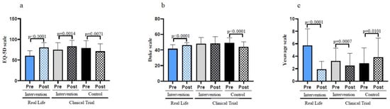 Self-rated emotional and social assessments before and after the interventions in old individuals. (a) Evaluation of the quality-of-life by using the EuroQol scale. (b) Results on the Duke Scale questionnaire for the social support perceived by the patient. (c) Results on the geriatric depression scale of Yesavage. Real-Life Intervention n = 50, Clinical Trial Intervention n = 51, Clinical Trial Control n = 49. Bars represent mean ± SD. Statistical analysis was performed with the Student’s t test for paired samples and the Wilcoxon test for non-parametric samples.