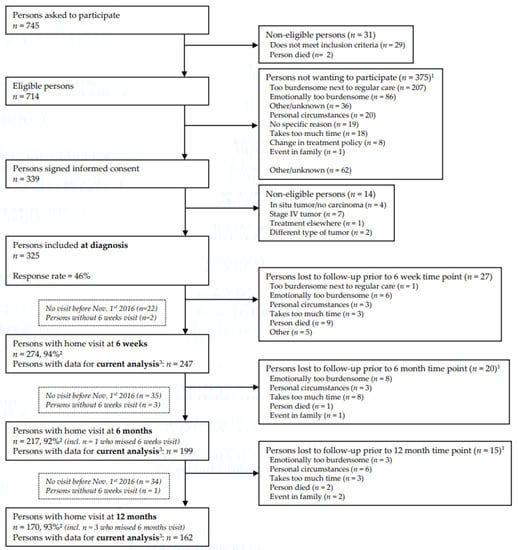Flow diagram of the inclusion of participants within the EnCoRe study and the number of post-treatment measurements included in the analyses presented in this paper. Data of home visits performed before November 1st, 2016, were included in the analyses. 1 Totals do not add up because some individuals reported multiple reasons for non-participation. 2 Response rate = (persons with home visits)/(persons with home visits + persons lost to follow-up—persons died). The declining number of participants at the subsequent time points is because that not all participants included at diagnosis from April 2012 onwards had reached these time points in November 2016. 3 Since the current analysis was focused on dietary intake and kynurenines after colorectal cancer treatment, only post-treatment measurements with available data on dietary intake, kynurenines and covariates were included. The number of participants with available dietary intake and kynurenine data were, respectively, n = 256 and n = 251 at 6 weeks, n = 236 and n = 206 at 6 months, and n = 221 and n = 166 at 12 months post-treatment.