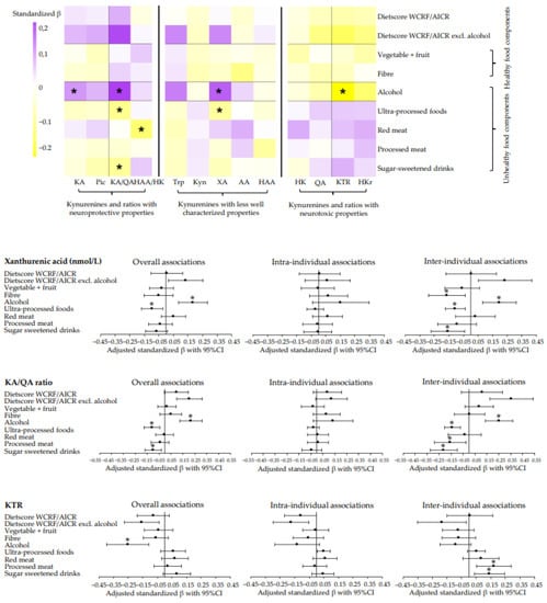 The following supporting information can be downloaded at: https://www.mdpi.com/article/10.3390/nu14235151/s1, Figure S1: Forest plots showing the confounder-adjusted linear mixed models between adherence to the dietary WCRF/AICR recommendations and metabolites and ratios of the kynurenine pathway; Figure S2: Forest plots showing the confounder-adjusted linear mixed models between adherence to the DHD recommendations and metabolites and ratios of the kynurenine pathway; Table S1: Confounder-adjusted overall longitudinal, intra-individual, and inter-individual associations (n = 247) between the dietary WCRF/AICR recommendations and metabolites of the kynurenine pathway; Table S2: Confounder-adjusted overall longitudinal, intra-individual, and inter-individual associations (n = 247) between the dietary WCRF/AICR recommendations and relevant kynurenine ratios; Table S3: Confounder-adjusted overall longitudinal, intra-individual, and inter-individual associations (n = 247) between the DHD recommendations and metabolites of the kynurenine pathway; Table S4: Confounder-adjusted overall longitudinal, intra-individual, and inter-individual associations (n = 247) between the DHD recommendations and relevant kynurenine ratios.
