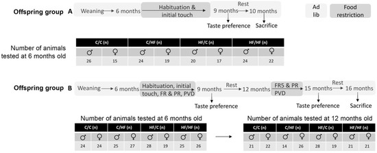 Offspring were divided into two groups, as shown in Figure 1. All animals began testing at 6 months of age and underwent 2 days of habituation in the chambers (20 min/day with free consumption of milkshake from the reward magazine) and then an initial touch protocol (15 trials over 60 min) [44]. Following this, offspring were divided into two groups, as follows: animals in group A did not undergo additional behavioural testing and were sacrificed at 10 months of age for tissue collection (Figure 1); mice in group B underwent a longitudinal assessment protocol in which they were tested sequentially on the fixed-ratio (FR), progressive ratio (PR), and paired visual discrimination (PVD) tasks. Animals were rested until 12 months of age and then run through FR5 before being re-tested on the PR2 schedule (Figure 1). Tissues were collected from group B mice when the animals were 16-months-old. The number of mice tested in each group is shown in Figure 1. Data obtained from the PVD task are presented in a separate manuscript (in preparation).