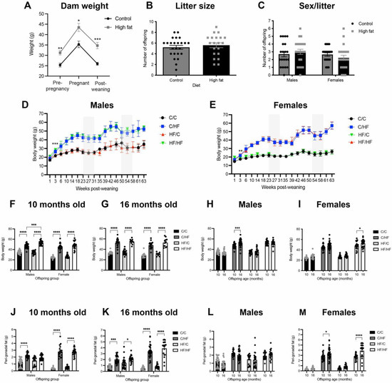 After 4 weeks of feeding, HF-fed dams weighed significantly more than C-fed dams, and this was maintained during gestation and after weaning (Figure 2A). No differences were observed in litter size, or in the male-to-female ratio of offspring born to C- and HF-fed mothers (Figure 2B,C). Male and female C/HF and HF/HF offspring weighed significantly more than C/C and HF/C animals within 3 weeks post-weaning (Figure 2D,E) and this weight difference was maintained throughout the experiment until sacrifice at 10- and 16-months-of-age (Figure 2F,G). A significant age-related weight gain was observed in C/HF males and HF/HF females, but body weight was constant between 10- and 16-months in the other offspring groups (Figure 2H,I). The HF-fed animals also had significantly more peri-gonadal fat than C-fed offspring at both ages (Figure 2J,K); however, only female C/HF and HF/HF mice showed an age-related increase in peri-gonadal fat weight (Figure 2L,M). Additional information about dam and offspring body weight, as well as food and calorie consumption, has been published previously [43].