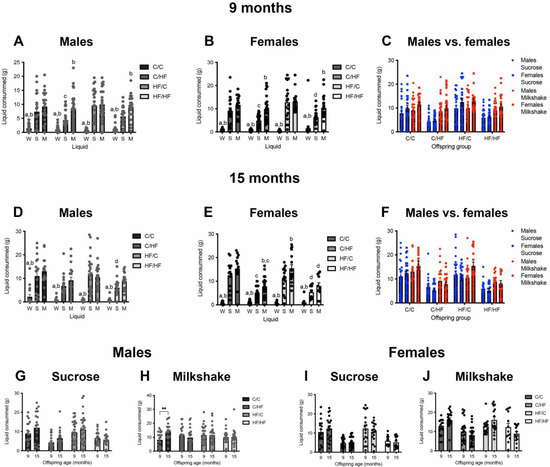 At 15 months of age, male mice drank the same amount of milkshake and sucrose regardless of pre- and postnatal diet (Figure 4D). In females, both C/HF and HF/C mice drank significantly more milkshake than sucrose, and a similar non-significant pattern was also observed in the C/C and HF/HF females (Figure 4E). Analysis of diet-related differences showed that C/HF and HF/HF females drank significantly less sucrose and milkshake than C/C and HF/C females, respectively. Aged males and females consumed similar amounts of both sucrose and milkshake regardless of diet group (Figure 4F). Compared to at 9 months of age, 15-month-old male and female C/C animals consumed significantly more milkshake; however, no age-related differences in sucrose or milkshake were noted in the other diet groups (Figure 4G–J).