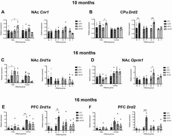Relative expression of markers of dopamine, μ-opioid, and endocannabinoids in the brains of 10-month-old offspring. (A,B) Relative mRNA levels of Crn1 in the nucleus accumbens (NAc, A) and Drd2 in the caudate–putamen (CPu, B) of 10-month-old male and female offspring groups. (C–F) mRNA levels of Drd1a (C,E), Oprm1 (D), and Drd2 (F) in the nucleus accumbens (C,D), and prefrontal cortex (PFC, E,F) of 16-month-old male and female offspring. Here, n = 4–5 for all groups. For comparisons between diet groups, mRNA levels are expressed relative to the male (M) or female (F) C/C group. For sex comparisons, levels are expressed relative to the males in each diet group. Here, * p < 0.05, ** p < 0.01, *** p < 0.001, and **** p < 0.0001, with one- or two-way ANOVA with Sidak’s post hoc.