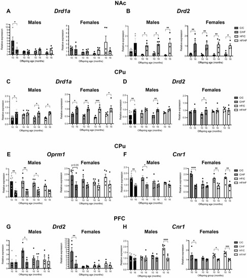 Expression of markers of dopamine, μ-opioid, and endocannabinoids in the brains of 10- vs. 16-month-old offspring. (A,B) Relative mRNA levels of Drd1a (A,C), Drd2 (B,D,G), Oprm1 (E), and Cnr1 (F,H) in the nucleus accumbens (NAc, A,B), caudate–putamen (CPu, C–F), and prefrontal cortex (PFC, G,H) of 10- and 16-month-old male and female offspring groups. The mRNA levels are expressed relative to levels in 16-month-old animals in each diet group. Here, n = 4–5 for all groups; * p < 0.05, ** p < 0.01, *** p < 0.001, **** p < 0.0001, for two-way ANOVA with Sidak’s post hoc.
