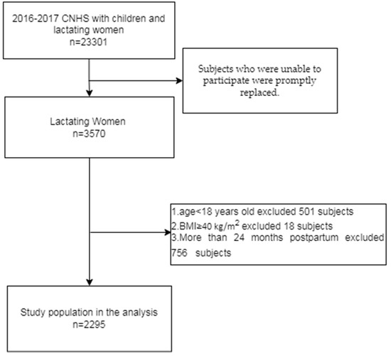 A total of 2295 lactating women subjects were included in this study, all within 2 years postpartum. This study was based on the “China Children and Lactating Mothers Nutritional Health Surveillance (2016–2017)” survey approved by the Chinese Center for Disease Control and Prevention (China CDC). This survey was organized by the China CDC, which organized nutrition experts to conduct argumentation, design questionnaires, and select survey sites, and was carried out by the provincial, municipal, and county CDC. Since lactating women were selected as the research sub-subjects in this survey, we chose this project as our data source. China CDC staff randomly selected the districts according to demographic proportion and economic distribution. All the staff involved in the intended sample survey have received unified training and assessment from China CDC to ensure that they work in accordance with unified standards. Hebei, Guizhou, and Shandong provinces, which are located on the coasts of North, Southwest, and East China, were selected. A total of 35 districts or counties were randomly selected based on geographic location and population distribution. These districts or counties include: Xinhua District of Shijiazhuang City, Xinji County of Shijiazhuang City, Lubei District of Tangshan City, Ren County of Xingtai City, Neiqiu County of Xingtai City, Wuqiang County of Hengshui City, Wangdu County of Baoding City, Lianchi District of Baoding City, Daming County of Handan City, Zhangbei County of Zhangjiakou City, Shuangqiao District of Chengde City, Xinhua District of Cangzhou City, Nanming District of Guiyang City, Kaili City of Qiandongnan Miao and Dong Autonomous Prefecture of Guizhou City, Kaiyang County of Guiyang City, Danzhai County of Qiandongnan Miao and Dong Autonomous Prefecture, Shuicheng County of Liupanshui City, Dejiang County of Tongren City, Shibei District of Qingdao City, Penglai City of Yantai City, Laizhou City of Yantai City, Lijin County of Dongying City, Shouguang City of Weifang City, Wucheng County of Dezhou City, Lingcheng District of Dezhou City, Lanshan District of Linyi City, Donga County of Liaocheng City, Dingtao District of Heze City, Linzi District of Zibo City, Sishui County of Jining City, Yishui County, and Linyi City. Two townships (streets) were selected from each district and county, and two village (neighborhood) committees were selected from each township (street). In each village (neighborhood) committee, 15 lactating women aged 18–50 were selected, and all of them were within 2 years postpartum. Subjects with overt disease, such as chronic urinary system disease, end-stage renal disease, tumor, and organ transplant, were excluded. We gathered subjects in township health centers, village clinics, and community health service centers for investigation. For this investigation, China CDC organized experts to formulate unified work manuals on the operation methods and quality control methods of the questionnaire, physical examination, and other project links. In order to ensure the quality of work, each province set up provincial quality control groups, which are trained and assessed strictly by the national working group in advance. All links of the investigation, including training, questionnaire survey, physical examination, blood sample transfer, and laboratory testing, have been strictly controlled. During the survey, quality control surveys were conducted using tablet computers and computer programs, and subjects who were unable to participate were promptly replaced. Promptly replaced occurs in the sampling stage, and each survey point is required to not exceed 5% of the amount. The subjects were approached, contacted, screened, etc., through local CDC departments and community health service centers. Local CDC staff screened participants/subjects for eligibility to be included (or not eligible) for participation in this study. The inclusion and exclusion process is shown in Figure 1.