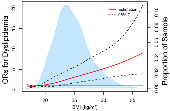 Representation of restricted cubic spline logistic regression models for BMI and risk of dyslipidemia. Red solid line shows OR as a function of BMI adjusted for age, age of children, numbers of birth, current smoking status, and current alcohol drinking.