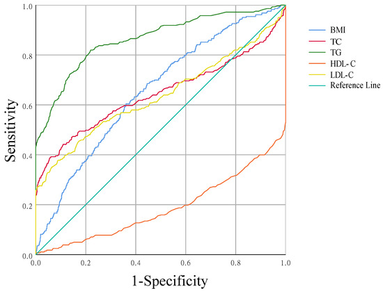 Figure 4 shows the ROC curve for the diagnosis of dyslipidemia using five indicators, AUC is BMI 0.655 (95% CI 0.621–0.688, p < 0.0001), TC 0.645 (95% CI 0.601–0.689, p < 0.0001), TG 0.864 (95% CI 0.838–0.891, p < 0.0001), HDL-C 0.188 (95% CI 0.155–0.220, p < 0.0001), and LDL-C 0.637 (95% CI 0.594–0.679, p < 0.0001). The best cut-off value for BMI was 24.85 kg/m2 according to the Youden index standard.