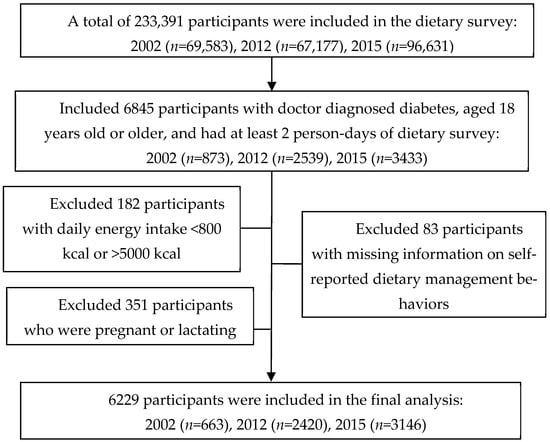 We analyzed data from the 2002, 2010–2013 (2012), and 2015 China National Nutrition Survey (CNNS), which is one of the most representative national cross-sectional surveys in China. The specific study design has been described elsewhere [15]. Briefly, in the 2002, 2012, and 2015 CNNS, subjects were selected from the resident population of 31 provinces, autonomous regions, and municipalities (except Taiwan, Hong Kong, and Macao) in China. All these studies used multi-stage stratified cluster random sampling. A total of 69,583, 67,177, and 96,631 subjects participated in the dietary survey across the three rounds of CNNS, respectively. The inclusion criteria for this study included: (a) subjects who completed the dietary recall for at least 2 days; (b) aged 18 years or older; (c) those with doctor-diagnosed diabetes. The exclusion criteria were as follows: (a) subjects were pregnant or lactating women; (b) with daily energy intake of less than 800 kcal or greater than 5000 kcal; (c) with missing information on self-reported dietary management behavior. We identified 64,067, 62,960, and 83,538 adults with diabetes that completed at least 2 days of the dietary recall in 2002, 2012, and 2015, respectively, and a total of 6229 patients with diabetes were included in the final analysis (Figure 1).