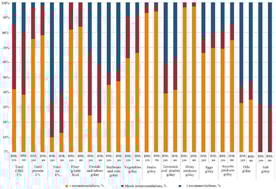 We observed that the majority of patients, both DPDM and NDPDM, did not meet the dietary recommendations (Figure 2). A higher percentage of patients met the dietary recommendations for total carbohydrates (carbohydrates%: 42.6 vs. 41.7%, p = 0.005) and fat (fat%: 24.4 vs. 26.9%, p = 0.004), while the percentage of patients who met the recommendation for the percentage of energy from protein was around 22% for both groups. Only 18.0% and 15.8% of subjects, respectively, fulfilled the recommendation of fiber intake in DPDM and NDPDM. For the intake of specific food groups, the proportion of DPDM meeting the recommended intake ranged from 3.3% to 42.8% and from 3.0% to 39.2% in NDPDM, DPDM showing an improvement in the intake of vegetables (28.0 vs. 24.7%, p = 0.028), cereals and tubers (42.8 vs. 39.2%, p < 0.001), and fruits (5.8 vs. 3.7%, p = 0.050). In addition, the salt consumption for more than 60% of the subjects was higher than the recommended level in both groups.