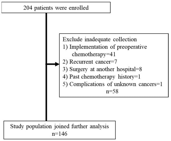 In total, 204 patients were included in the database. Among them, we excluded 41 patients who had received preoperative chemotherapy, seven with recurrent cancer, eight who underwent surgery at another hospital, and one with previous chemotherapy. Furthermore, one patient with an unknown cancer was excluded. Accordingly, 146 patients were included in this study (Figure 1).