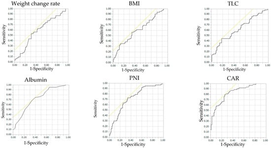 As appropriate, clinicopathological parameters were compared using the Mann–Whitney U test, chi-square test, or Fisher’s exact test. Using receiver operating characteristic curve analysis, we compared the discriminatory ability of BMI, weight change rate, TLC, ALB, PNI, and CAR to detect patients who did not complete WTC. The AUC of each indicator was compared, and the indicator with the maximum values was used for survival analysis. The cut-off value was determined using the maximum Youden index, calculated as sensitivity + specificity − 1.