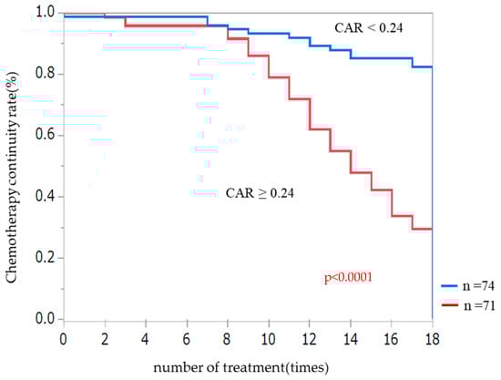 Kaplan–Meier curves of chemotherapy continuation according to the CAR. Patients were divided into two groups with 0.24 as the cut-off value. CAR: C-reactive protein-to-albumin ratio.