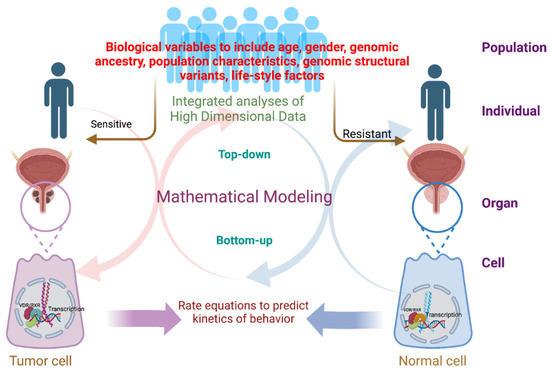 A workflow for top-down and bottoms-up system biology (SB) approaches to address prostate cancer health disparities. For top-down SB there is a plethora of high dimensional data including germline structural variants, population characteristics as serum-borne, and other clinical data that can be integrated through a range of approaches to deliver insights into how the prostate could either be either sensitive or resistant to the growth restraint properties of the VDR. From the bottoms-up perspective, more focused kinetic models can be developed for how the VDR functions and is disrupted between normal and tumor cells. Combining these approaches has the potential to develop a holistic understanding of how the VDR functions in the prostate gland and how this is impacted by genomic ancestry.