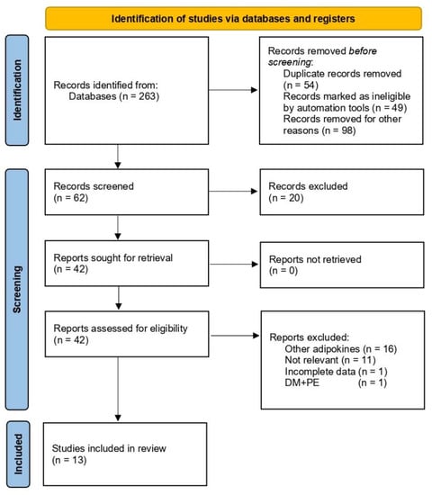 The detailed search in the databases identified 263 articles. Of these, and after removing the duplicates and animal model studies, 62 articles remained eligible for screening. In the screening, based on their titles and abstracts, 20 articles were further excluded since they presented studies of other adipokines. After the retrieval of the articles, 29 were excluded further: 16 studies investigated other adipokines, 11 were found to be irrelevant, one did not mention the measuring unit of RBP4 and one examined preeclampsia in already diabetic patients. Finally, 13 articles were included in this study (see Figure 1). The researchers had high inter-rater agreement on study inclusion (Kappa = 0.86, p < 0.001). All included studies were of intermediate to high quality; their features are detailed in Table 1.