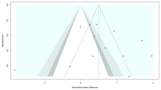 We investigated the presence of reporting bias visually, by depicting the studies in the funnel plot, and quantitatively, by performing an Egger’s test. The funnel plot showed a symmetrical plot of the included studies (Figure 3) and the result of the Egger’s test (t = 0.43; p = 0.587) was found nonsignificant.