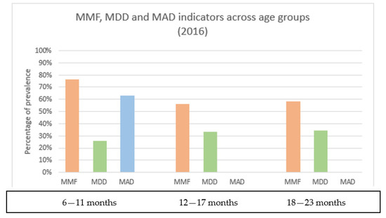 A greater proportion of children between 6 and 11 months were found to reach MMF (76%) compared to older children. Conversely, the MAD indicator was met by the youngest age group only (63%). However, the proportion of children meeting the MDD indicator was low among all age groups, ranging from 26% (children 6–11months) to 34% (18–23 months) (Figure 1).
