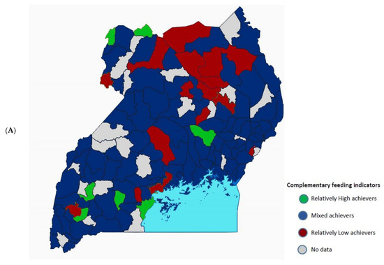 Complementary feeding prevalence varied geographically within Uganda, with areas of high and low prevalence inconsistent across indicators (Figure 2A,B). A relatively low percentage of children living in the northern districts of Uganda met three or more complementary feeding indicators, although most of them started complementary feeding at 6 months of life. Conversely, in western and central Ugandan districts, we observed the highest percentage of children achieving three or more complementary feeding indicators, but this trend was not found for Kampala district. Sixty to eighty percent of children in many Ugandan districts reached the introduction of complementary feeding indicator, while the MDD and MAD indicators were only achieved by 20–40% of children in most of the regions.