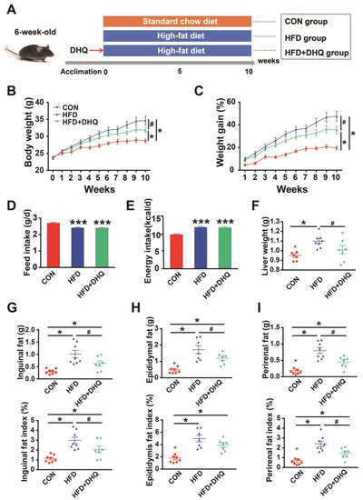 Effects of DHQ on growth performance and lipid deposition in mice. (A) Animal breeding scheme (three groups); (B) body weight; (C) weight gain; (D) feed intake; (E) energy intake; (F) liver weight; (G) inguinal fat weight and index; (H) epididymal fat weight and index; (I) perirenal fat weight and index. Data were expressed as the mean ± SEM. * p < 0.05, *** p < 0.001 vs. CON group, # p < 0.05 vs. HFD group.