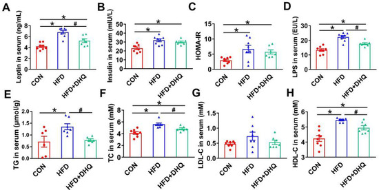 Effects of DHQ on serum parameters in mice. (A) Leptin; (B) insulin; (C) HOMA-IR; (D) LPS; (E) TG; (F) TC; (G) LDL-C; and (H) HDL-C. Data were expressed as the mean ± SEM. * p < 0.05 vs. CON group, # p < 0.05 vs. HFD group.