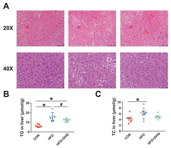 Effects of DHQ on lipid deposition in livers of mice. (A) H&E staining images of hepatic tissue; (B) TG level; and (C) TC level. Data were expressed as the mean ± SEM. * p < 0.05 vs. CON group, # p < 0.05 vs. HFD group.
