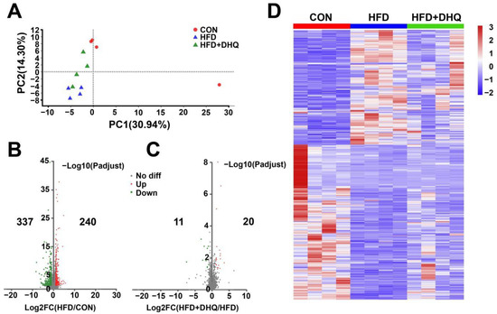 Effects of DHQ on hepatic genes expression in mice. (A) PCA score plots; (B) volcano plots of DEGs in CON vs. HFD; (C) volcano plots of DEGs in HFD vs. HFD+DHQ groups. Each dot represents a particular gene, and its corresponding horizontal and vertical values are gene expressive changes in the CON and HFD groups or HFD and HFD+DHQ groups, respectively. The red dots mean up-regulated genes expressed significantly, the green dots mean down-regulated genes expressed significantly, and the gray dots mean the genes expressed not significantly; and (D) heatmap of all DEGs altered by HFD and DHQ treatment.