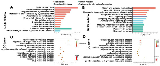 To characterize the functional results of DEGs provoked by the HFD and DHQ, KEGG and GO analysis was performed. By matching altered genes to the KEGG database, DEGs were functionally annotated in metabolism, human diseases, and organismal systems. As shown in Figure 5A, DEGs in the CON and HFD groups were the most enriched in metabolism, including retinol metabolism, steroid hormone biosynthesis, and drug metabolism-cytochrome P450. Moreover, chemical carcinogenesis was the most enriched in human diseases term, as the inflammatory mediator regulation of TRP channels was the most enriched in organismal systems term. In contrast, for altered gene sets in the HFD and HFD+DHQ groups, metabolism, human diseases, organismal systems, and environmental information processing were the most abundant functional groups. Metabolism and environmental information processing terms, including starch and sucrose metabolism, arachidonic acid metabolism, and the FoxO signaling pathway, were significantly enriched, as human diseases and organismal systems terms such as the adipocytokine signaling pathway, pancreatic secretion, central carbon metabolism in cancer, and pathways in cancer were enriched in our results (Figure 5B). A further investigation based on GO enrichment analysis showed several enriched processes such as the cholesterol biosynthetic process, the regulation of the triglyceride metabolic process, and the long-chain fatty acid metabolic process involved in lipid metabolism in DEGs from the CON and HFD group (Figure 5C). However, DHQ mainly altered the genes associated with glucan metabolic process, glycogen metabolic process, and glucose homeostasis (Figure 5D).