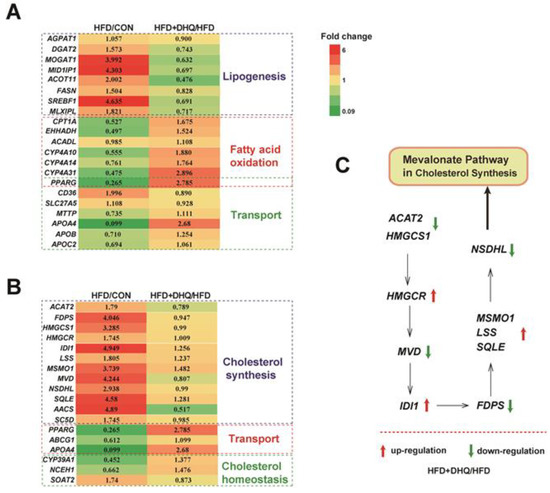 Effects of DHQ on fold change of lipid metabolic-related gene expression in liver in mice. (A) TG metabolism-related genes; (B) TC metabolism-related genes; (C) Mevalonate pathway in cholesterol synthesis. The red arrow represents up-regulation, and the green arrow represents down-regulation.