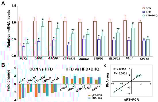 To prove the correctness of the results obtained from RNA-seq analysis, qRT-PCR was employed to analyze the mRNA expression of nine genes selected randomly, including phosphoenolpyruvate carboxykinase 1 (PCK1), lipin 2 (LPIN2), glycerophosphocholine phosphodiesterase 1 (GPCPD1), CYP4A32, abhydrolase domain containing 2 (ABHD2), sphingomyelin phosphodiesterase 3 (SMPD3), elongation of very long chain fatty acid elongase 2 (ELOVL2), Fibrinogen-like protein 1 (FGL1), and CPT1A. Relative to the CON group, several genes were markedly down-regulated in the HFD group, including PCK1, LPIN2, GPCPD1, CYP4A32, ABHD2, SMPD3, ELOVL2, FGL1, and CPT1A (p < 0.05). Meanwhile, it was found that DHQ significantly enhanced the expression of LPIN2, GPCPD1, CYP4A32, ELOVL2, and FGL1 for mice induced by HFD (p < 0.05) (Figure 7A). In brief, the expression trends of the detected genes were highly in conformance with the results obtained by RNA-seq (Figure 7B,C). Differences in fold change values were likely due to the different detection sensitivity of the two methods [14].
