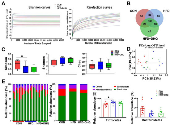 Effects of DHQ supplementation on fecal microbiota diversity and microbial composition at phylum level in mice. (A) Dilution curves; (B) Venn diagram; (C) α-diversity; (D) PCoA; and (E) microbial composition at phylum level. Data were expressed as the mean ± SEM. * p < 0.05 vs. CON group.