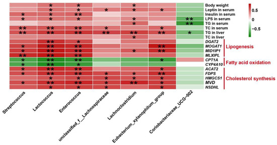 The relevance of the altered gut microbiota and lipid metabolism-associated indicators were evaluated by Pearson’s correlation analysis and visualized through heatmap (Figure 10 and Figure S2). As demonstrated in Figure 10, the relative abundance of Streptococcus was significantly positively associated with serum insulin, LPS, TC, and hepatic TG levels. The richness of Lactococcus and Enterorcoccus had positive relationship with body weight, serum leptin, insulin, LPS, TC, and hepatic TG levels. Moreover, the relative richness of unclassified_f_Lachnospiraceae and Eubacterium_xylanophilum_group showed positive correlation with the amounts of leptin, TC in serum, and TG in liver. Furthermore, the relative abundance of Lachnoclostridium correlated positively with body weight, serum leptin, LPS, TG, and hepatic TG, TC levels. Besides, it is clear that the relative abundance of Coriobacteriaceae_UCG-002 had negative correlation with serum LPS, TG and hepatic TG levels. Meanwhile, the correlation analysis between flora and key genes in the hepatic transcriptome data was performed. The results indicated that the relative abundance of Streptococcus and Eubacterium_xylanophilum_group was significantly positively related to MOGAT1, MID1IP1, ACAT2, FDPS, and MVD, but significantly negatively correlated with CPT1A expression. The richness of Lactococcus and Enterorcoccus showed positive correlation with the expression of DGAT2, MOGAT1, MID1IP1, MLXIPL, ACAT2, FDPS, HMGCS1, MVD, and NSDHL, but negative correlation with CPT1A and CYP4A10 expression. Furthermore, there was a positive relationship between the richness of unclassified_f_Lachnospiraceae and the expression of FDPS, HMGCS1, MVD and NSDHL in the liver. In addition, the proportion of Lachnoclostridium had positively correlation with MID1IP1, FDPS, HMGCS1, and MVD mRNA levels.
