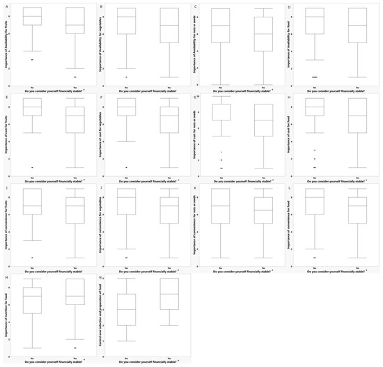 Ratings of importance of factors for food consumption by perception of financial stability. * Q < 0.1 for comparisons within categories: (A) Importance of availability for fruit; (B) Importance of availability for vegetables; (C) Importance of availability for nuts or seeds; (D) Importance of availability for food; (E) Importance of cost for fruits; (F) Importance of cost for vegetables; (G) Importance of cost for nuts or seeds; (H) Importance of cost for food; (I) Importance of convenience for fruits; (J) Importance of convenience for vegetables; (K) Importance of convenience for nuts or seeds; (L) Importance of convenience for food; (M) Importance of nutrition for food; (N) Control over selection and preparation of food.
