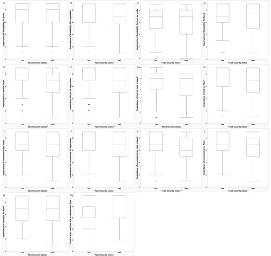 Ratings of importance of factors for food consumption by food security status. * Q < 0.1 for comparisons within categories: (A) Importance of availability for fruit; (B) Importance of availability for vegetables; (C) Importance of availability for nuts or seeds; (D) Importance of availability for food; (E) Importance of cost for fruits; (F) Importance of cost for vegetables; (G) Importance of cost for nuts or seeds; (H) Importance of cost for food; (I) Importance of convenience for fruits; (J) Importance of convenience for vegetables; (K) Importance of convenience for nuts or seeds; (L) Importance of convenience for food; (M) Importance of nutrition for food; (N) Control over selection and preparation of food.