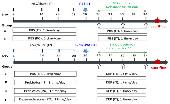 - Group E (PO Probiotics group): PO-Probiotics (2.0 × 107 CFU/mL, 10 mL/kg/rat) + IP-challenged OVA + IT DEP,