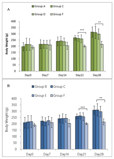 We intratracheally administered probiotics (LP33) to the experimental group for 28 days, and induced by OVA (2 mg/kg, IP) once per week during this period. We monitored body weight before and after the experimental period. During the period, the average weight of each group continued to increase, except for the group of rats treated with dexamethasone via oral administration (Figure 2A,B). According to the literature, long-term administration of dexamethasone inhibits the food intake and body-weight gain of rats.