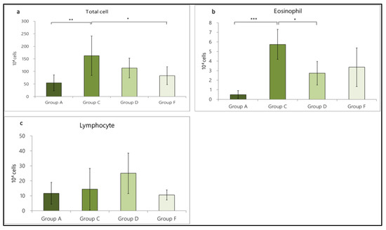 In terms of cell number, the total number of cells in Group A was 54.56 ± 31.56 × 104, including eosinophils (0.49 ± 0.41 × 104) and lymphocytes (11.69 ± 7.24 × 104). In Group C, we found notable cell-infiltration (162.65 ± 78.62 × 104), including eosinophils (5.74 ± 1.56 × 104) and lymphocytes (14.47 ± 13.86 × 104). The total cell number (p = 0.002 < 0.01) and eosinophil number (p = 0.000 < 0.001) statistically differed between Groups A and C, suggesting that the OVA/DEP-induced allergic mode increased the expression of inflammatory cells in the BALF. In addition, in Group D (intratracheal administration of LP33) and Group F (oral administration of dexamethasone), the total cell number was 113.67 ± 39.16 × 104, including eosinophils (2.73 ± 1.23 × 104) and lymphocytes (25.06 ± 13.53 × 104). In Group F, the total cell number was 82.93 ± 35.53 × 104, including eosinophils (3.26 ± 2.01 × 104) and lymphocytes (10.55 ± 3.33 × 104). Compared with Group C, Group F showed significantly reduced cell-infiltration (p = 0.021 < 0.05). The total cell and eosinophil numbers in Group D were reduced by 30.1% and 52.4%, respectively; in Group F, they were reduced by 49.0% and 43.2%, respectively (Figure 3a–c).