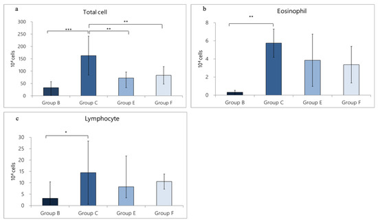 In terms of cell number, the total number of cells in Group B was 33.19 ± 24.28 × 104, including eosinophils (0.31± 0.21 × 104) and lymphocytes (3.20 ± 2.75 × 104). In Group C, significant cell-infiltration was found (162.65 ± 78.62 × 104), including eosinophils (5.74 ±1.56 × 104) and lymphocytes (14.47 ± 13.86 × 104). Total cell numbers (p = 0.000 < 0.001), lymphocytes (p = 0.027 < 0.05), and eosinophil (p < 0.01) were statistically different between Group B and Group C, suggesting that the OVA/DEP-induced allergic mode could increase the expression of inflammatory cells in BALF. In addition, in Group E (oral administration of LP33 group) and Group F (oral administration of dexamethasone group), the cell numbers of Group E were the following: total cell number (72.21 ± 24.06 × 104), eosinophil (3.84 ± 2.88 × 104) and lymphocytes (8.23 ± 4.86 × 104), and the cell numbers of Group F were the following: total cell number (82.93 ± 35.53 × 104), eosinophil (3.26 ± 2.01 × 104) and lymphocytes (10.55± 3.33 × 104). Compared with Group C, both Group E and Group F reduced the total cell numbers and showed significant differences (p = 0.003 < 0.05 and p = 0.009 < 0.05, respectively). Among them, the total cell number and eosinophil numbers in Group E were reduced by 55.6% and 33.1% respectively, and in Group F they were reduced by 49.0% and 43.2%, respectively (Figure 4a–c).
