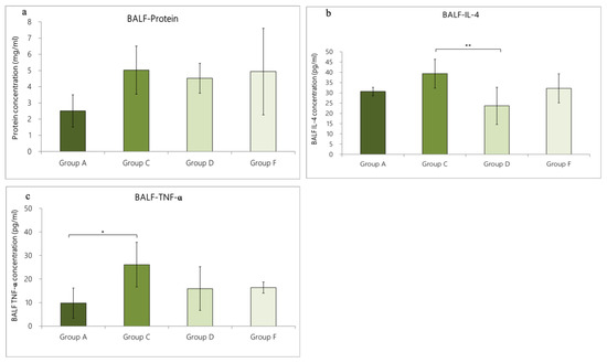 In Group A, the contents of total protein, IL-4, and TNF-α were 2.5 ± 1.0 mg/mL, 30.7 ± 2.1 pg/mL, and 9.8 ± 6.4 pg/mL, respectively. In Group C, a large amount of cytokines was secreted, including total protein (5.0 ± 1.5 mg/mL), IL-4 (39.3 ± 7.0 pg/mL), and TNF-α (26.1 ± 9.5 pg/mL). Compared with Group C rats, the expression levels of total protein, IL-4, and TNF-α in the BALF of Group A rats were lower, but only the TNF-α expression level in BALF was statistically different (p = 0.038 < 0.05). The cytokine expression in Group D rats (intratracheal administration of LP33) was as follows: total protein, 4.5 ± 0.9 mg/mL; IL-4, 23.7 ± 9.1 pg/mL, and TNF-α, 15.9 ± 9.3 pg/mL. The cytokine expression of the Group F rats (oral administration of dexamethasone) was 4.9 ± 2.7 mg/mL total protein, 32.2 ±7.1 pg/mL IL-4, and 16.4 ± 2.4 pg/mL TNF-α. Compared with Group C, only IL-4 in Group D was significantly reduced (p = 0.004 < 0.01). The IL-4- and TNF-α-levels in Group D were reduced by 39.7% and 39.1%, respectively; in Group F, they were reduced by 18.1% and 37.2%, respectively (Figure 5a–c).
