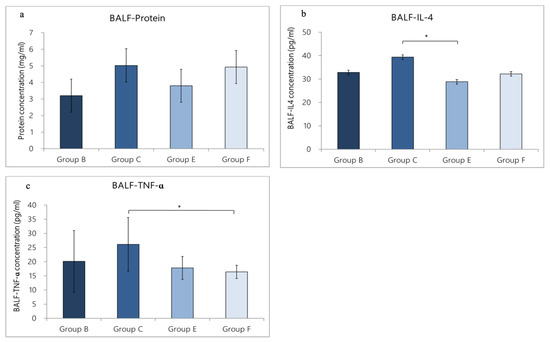 We washed the left lungs three times with 2 mL PBS (6 mL). We centrifuged the BALF at 2000 rpm at 4 °C, for 10 min. We adjusted the cell precipitation to 1 × 106 cells/mL, and we smeared and dried the cells after staining with Liu’s stain. We counted and identified at least 200 cells as eosinophils, neutrophils, or lymphocytes, under a light microscope at 200× magnification. We centrifuged the supernatant of BALF 3000 rpm at 4 °C for 10 min, which we then stored at −70 °C. We used ELISA kits to determine the IL-4 and TNF-α concentrations in the BALF.