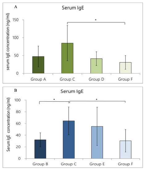 We used ELISA to evaluate the expression level of IgE. The rat-serum-IgE levels in Groups A and C were 25.0 ± 7.4 and 84.7 ± 49.5 ng/mL, respectively. The concentration of IgE in Group A was lower than that in Group C, but this difference was not statistically significant (p > 0.05). In Groups D and F, the serum-IgE concentrations were 41.0 ± 19.2 and 30.5± 19.2 ng/mL, respectively; compared with Group C, the IgE concentration was lower in these groups by 51.6% and 64.0%, respectively. The Group F serum-IgE concentration was significantly different from that of Group C (p = 0.035 < 0.05) (Figure 7A).