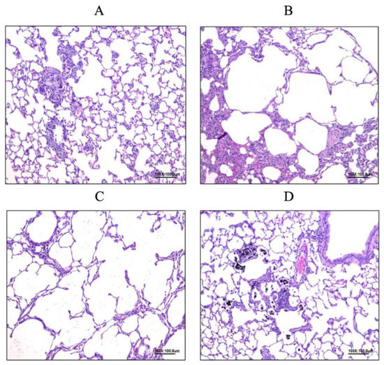 We removed the right lung of the rats, which we then fixed with 10% neutral formalin, embedded in paraffin, sectioned into a thickness of 4−6 μm, and stained with hematoxylin and eosin (H&E) for histopathology. We observed the damage and infiltration of inflammatory cells in the lung tissue, using light microscopy.