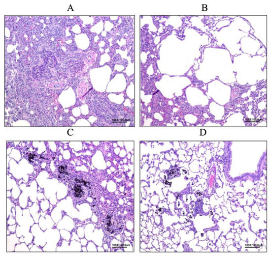 Effect of intratracheal-probiotic-Lactobacillus paracasei LP33 administration on histopathological changes in lung tissues induced by Group C (OVA-DEP group) in asthmatic rats: (A) granuloma, multiple localized, mild, lung; (B) emphysema, alveolar cavity, multiple local, moderate, lung; (C) emphysema, alveolar cavity, multiple local, moderate, lung; (D) granuloma, multiple localized, mild, lung. Magnification for all: 100×.