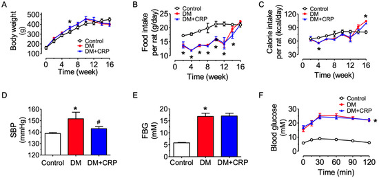Male Sprague Dawley rats were randomly assigned into three groups which had similar body weight at the start of the experiment, and rats feeding on a high-fat diet (HFD) had a moderately higher increase in body weight than the control group feeding on normal chow (Figure 1A). The food intake in terms of weight for consumption of HFD was less than that of normal chow by the control rats (Figure 1B); nevertheless, the calorie intake was similar among the groups (Figure 1C). After streptozotocin (STZ) injection at week 10, the body weight in the diabetic rats was reduced, whilst the food/calorie intake was increased. The CRP treatment (400 mg/kg/day, 4 weeks) had no effect on body weight and food/calorie intake in the diabetic rats. The blood glucose levels of the model rats were significantly higher at each time point than those of the control rats (Figure 1E,F). The systolic blood pressure (SBP) in HFD/STZ-induced diabetic rats was significantly increased, and the hypertensive condition was significantly mitigated by CRP treatment (Figure 1D). However, the blood glucose level was not altered by CRP treatment, as indicated in the results of the fasting blood glucose (FBG) determination and oral glucose tolerance test (Figure 1E,F). The elevated FBG and glucose intolerance supported that the type 2 diabetes model was successfully induced in rats.