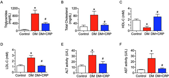 Effect of CRP extract on plasma lipid profile and liver function biomarkers in rats. Levels of (A) triglycerides, (B) total cholesterol, (C) high-density lipoprotein cholesterol (HDL-C), (D) low-density lipoprotein cholesterol (LDL-C), and (E) alanine aminotransferase (ALT) and (F) aspartate transaminase (AST) activities detected in plasma. Data are mean ± SEM from five rats for each group. * p < 0.05 DM vs. Control; # p < 0.05 DM + CRP vs. DM.