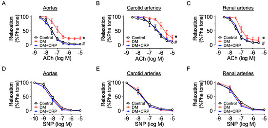 Vascular protective effects of CRP extract on diabetic rats. (A–C) Effects of oral administration of CRP (400 mg/kg/day for 4 weeks) on acetylcholine (ACh)-induced endothelium-dependent relaxations in the aortas, carotid arteries and renal arteries of diabetic rats. (D–F) Sodium nitroprusside (SNP)-induced endothelium-independent relaxations in the aortas, carotid arteries and renal arteries of diabetic rats. Data are mean ± SEM from five rats for each group. * p < 0.05 DM vs. Control; # p < 0.05 DM + CRP vs. DM.