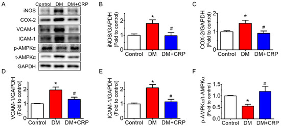 Effect of CRP extract on the protein expressions of inflammation markers in the rat aortas. (A) Representative blots and (B–F) summarized data showing the effect of CRP extract treatment (400 mg/kg body weight, 4 weeks) on aortic inflammation in diabetic rats, including iNOS (130 kDa), COX-2 (74 kDa), VCAM-1 (110 kDa), and ICAM-1 (90 kDa) compared with GAPDH (36 kDa) as well as the phosphorylation of AMPKα at Thr172 (p-AMPKα; 62 kDa) compared with its total protein (t-AMPKα). Data are mean ± SEM from five rats for each group. * p < 0.05 DM vs. Control; # p < 0.05 DM + CRP vs. DM.