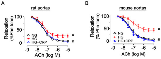 Vasoprotective effect of CRP in aortas from SD rats and C57BL/6J mice ex vivo. Effect of CRP extract (400 µg/mL) on acetylcholine (ACh)-induced endothelium-dependent relaxations of aortas (A) from rats exposed to high glucose (HG, 44.4 mM, 5 h) and (B) from mice (30 mM, 48 h). Data are mean ± SEM of 4 experiments. * p < 0.05 HG vs. NG; # p < 0.05 HG + CRP vs. HG.