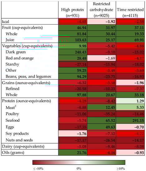 The magnitude of dietary change was greatest for the macronutrient restricted and time-restricted diet patterns for total fruit (up to 0.39 cup-equivalents) and whole grains (up to 0.92 oz-equivalents). Others have demonstrated that each additional 100 g increase in daily intake of fruit is associated with a 6–14% reduced risk of coronary heart disease, stroke, and all-cause mortality [9,48], and Micha et al. (2017) reported that each additional 50 g increase in daily intake of whole grams is associated with a 3–12% reduced risk of cardiovascular disease and diabetes [9]. These findings show that even small dietary changes can yield meaningful health gains if sustained over time and can yield even larger health gains for every incremental improvement in dietary intake. These results provide a valuable resource to health professionals when counseling their clients about practical dietary changes to increase consumption of food groups to align with federal dietary guidelines.