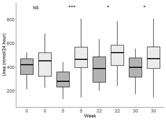 Twenty-four-hour UUN excretion. Dark boxes represent CD group and light boxes represent CRHP group. Before intervention start (week 0), during food provision (week 5), during and at end of follow-up (week 22 and 30). Between diet groups significance level; * p < 0.05, *** p < 0.001, NS = not significant.